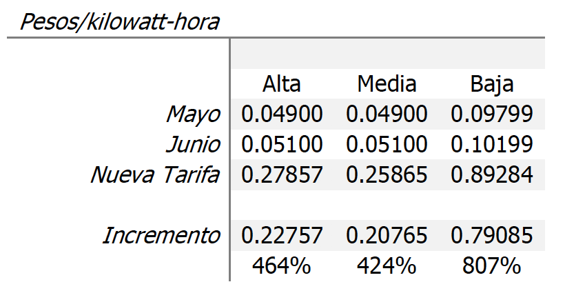 En el mes de junio para alta tensión o media el valor es de 0.05100 por cada KW y el actualizado para el Mercado eléctrico es de 0.10614, una diferencia del 108%. Pero al tener la nueva tarifa incrementa de acuerdo con la siguiente tabla: