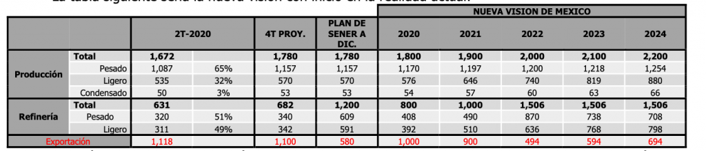 En México hemos llegado con esta pandemia a volver estar al mismo ciclo de la economía mexicana, ha tener visiones sexenales a un limite de tiempo corto y sin tener una misión de largo plazo. Existe un documento denominado memorándum del presidente de México a servidores públicos e integrantes de los órganos reguladores del sector energético. En el caso que dicho documento haya sido enviado o leído, indica la nueva visión de la administración y dando a lugar a una readecuación en el plan de desarrollo nacional, este cambio se deberá principalmente ante la falta de recursos de la inversión pública y, ante la incertidumbre económica actual que en México está aconteciendo. El documento tiene varios puntos que llama la atención y debemos considerar para cualquier negocio energético en México. Confirma que no hay dinero para PEMEX-CFE, y para cubrir toda la demanda en crecimiento en la parte energética que necesita el país por parte de la inversión pública. No llegarán a 1.2 Millones de barriles el envío a las seis refinerías en diciembre del 2020 como se ha comentado, si no será hasta el 2022. La máxima producción nacional esperada entre PEMEX y Privados seria de 2.2 millones de barriles al 2022. La tabla siguiente seria la nueva visión con inicio en la realidad actual: