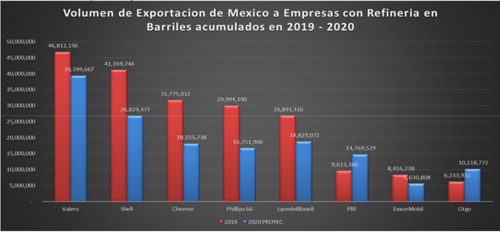 - Dejaríamos de exportar y, la pregunta a la SHCP tendrá alguna estrategia para compensar las divisas en dólares que pudieran dejar de entrar al país con base al tipo de cambio que podría estar entre los 22 a 23 dólares. Con información de Clipper Data; México exporto a EUA de acuerdo con el cierre del 2019 y con proyección de las ocho empresas que tienen un contacto directo en la compra de crudo, vemos una relación comercial de largo plazo como la empresa Valero; importa en un promedio entre 120 a 130 mil barriles por día durante el 2019 y que ayuda a que el país tenga divisas. Ante esta situación al reducir la disponibilidad de crudo de exportación en 2022, PEMEX y la nación deberán seleccionar a donde y a quien vender en los futuros contratos, siendo las empresas de EUA la prioridad ante la reducción de costos de logística comparado con Europa o Lejano Oriente.