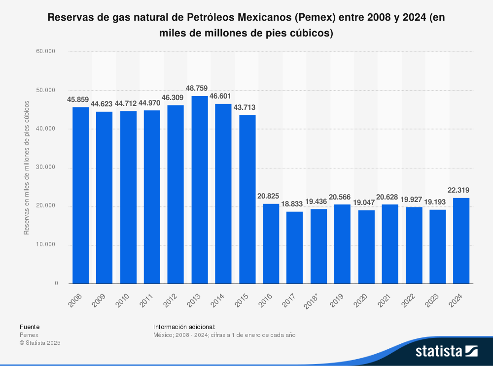 De acuerdo con datos recopilados desde 2008 hasta 2024, las reservas de gas natural de Pemex han experimentado fluctuaciones a lo largo de los años. En 2024, las cifras indican un repunte en las reservas, consolidándose por encima de los 22 billones de pies cúbicos. Este aumento es significativo, considerando que en años anteriores las reservas habían mostrado una tendencia a la baja, alcanzando su punto más bajo en 2016 con 20.825 billones de pies cúbicos.