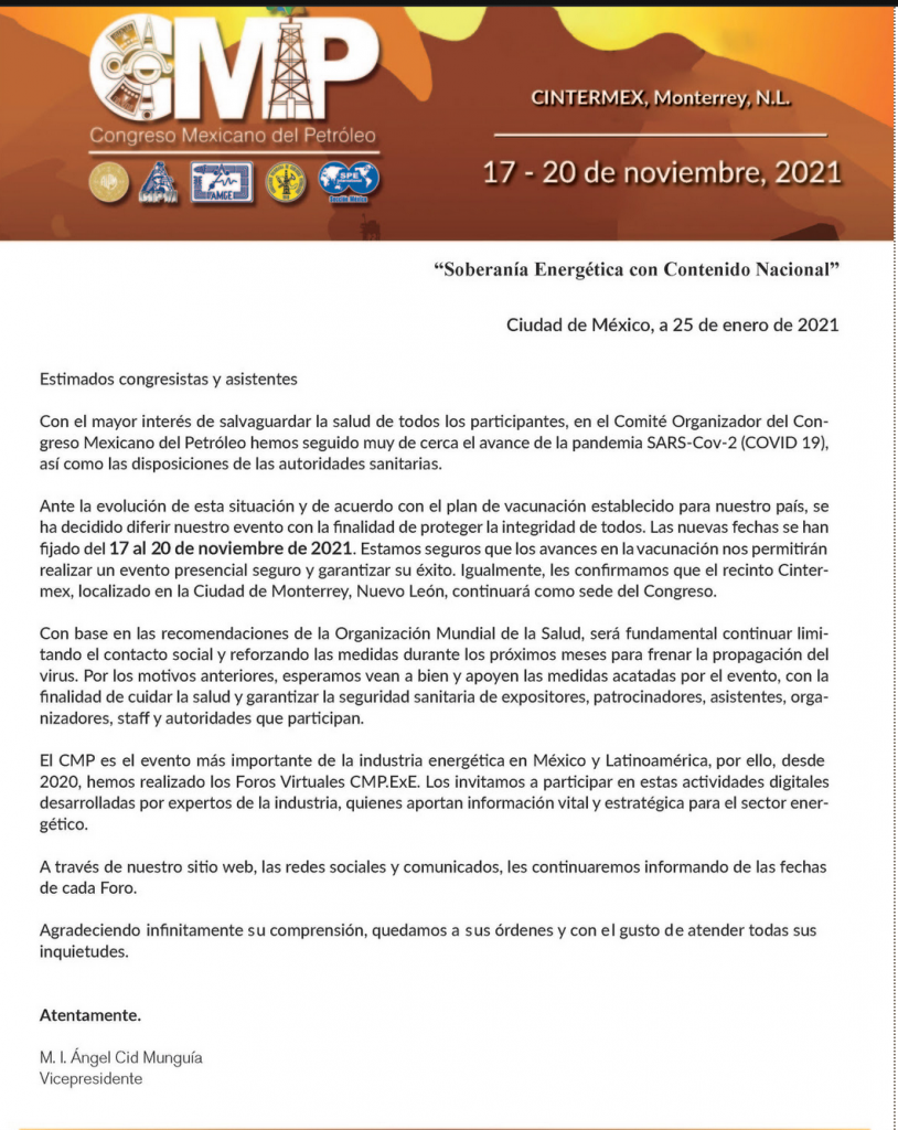 Evento del CMP será del 17-20 de noviembre de 2021