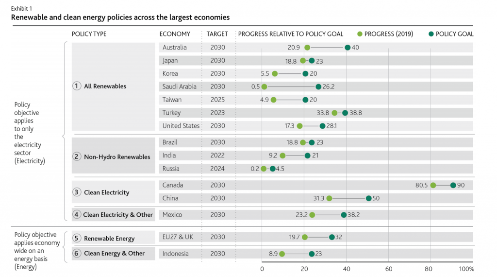 - Todas las principales economías del mundo tienen objetivos para expandir la electricidad limpia o renovable para reflejar sus planes de descarbonización y su compromiso con el Acuerdo de París