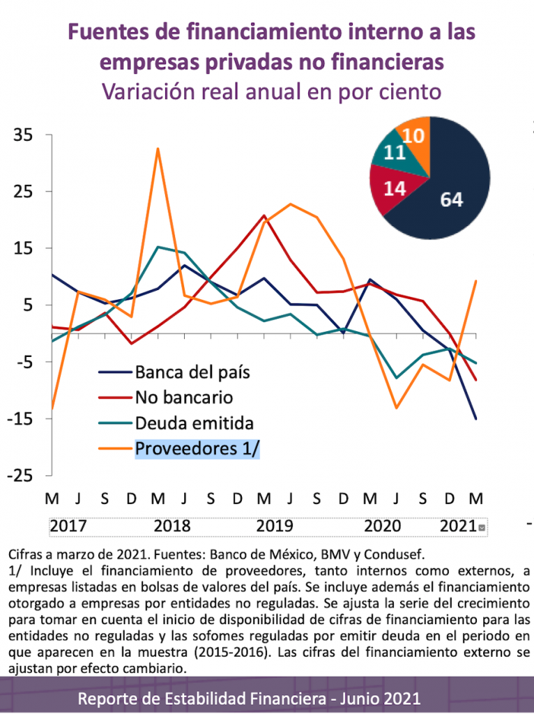 Esto se aprecia claramente en el último informe emitido por el Banco de México (Banxico) donde se denota un incremento en apalancamiento de las empresas mediante sus proveedores y la caída del financiamiento por medio de la banca del país que ha sido la más pronunciada de todas las citadas por el informe como fuente de financiamiento a empresas privadas no financieras.